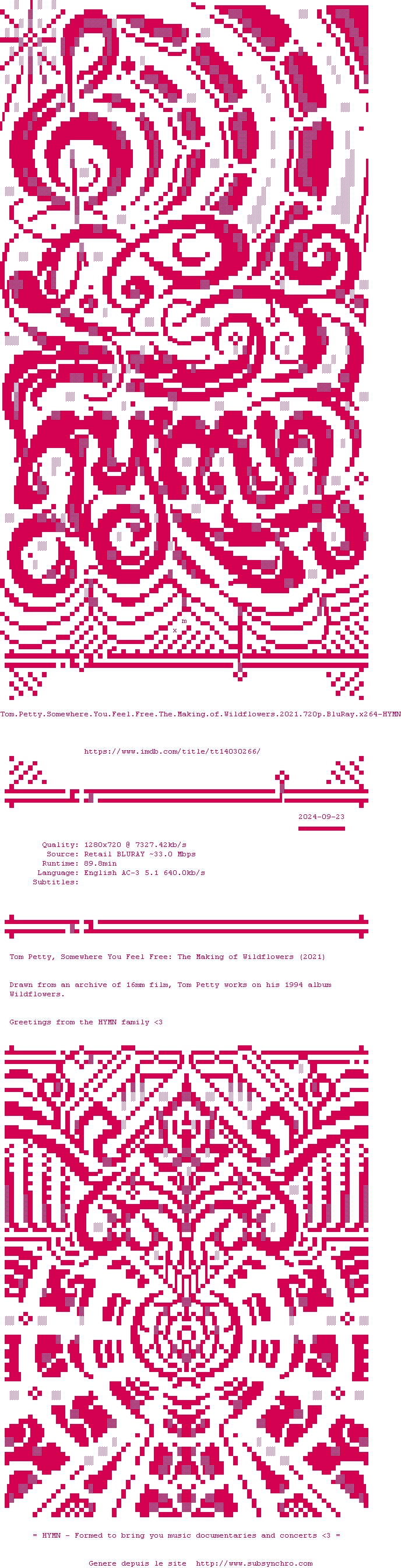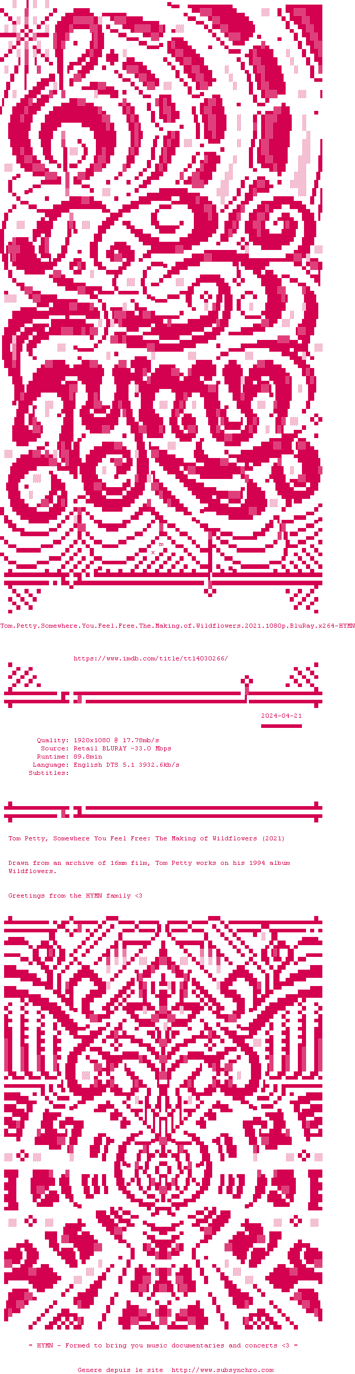 Voir le nfo de la release Tom.Petty.Somewhere.You.Feel.Free.The.Making.Of.Wildflowers.2021.720p.BluRay.x264-HYMN