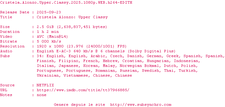 Voir le nfo de la release Cristela.Alonzo.Upper.Classy.2025.1080p.WEB.H264-EDITH