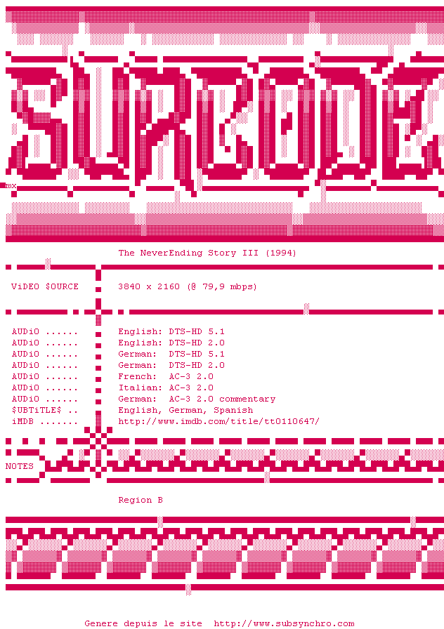 Voir le nfo de la release The.Neverending.Story.III.1994.COMPLETE.UHD.BLURAY-SURCODE