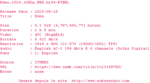 Voir le nfo de la release Eden.2024.2160p.4K.WEB.x265.10bit.AAC5.1-YTS