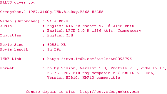 Voir le nfo de la release Creepshow.2.1987.2160p.UHD.BluRay.H265-MALUS