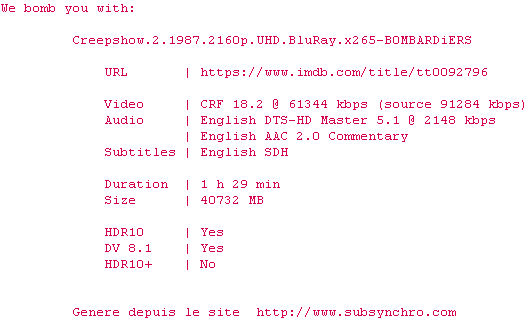 Voir le nfo de la release Creepshow.2.1987.2160p.UHD.BluRay.x265-B0MBARDiERS