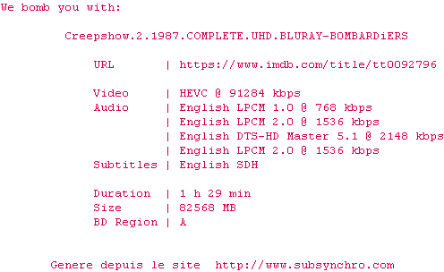 Voir le nfo de la release Creepshow.2.1987.COMPLETE.UHD.BLURAY-B0MBARDiERS