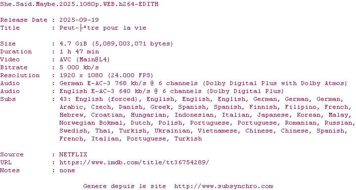Voir le nfo de la release She.Said.Maybe.2025.1080p.WEB.H264-EDITH
