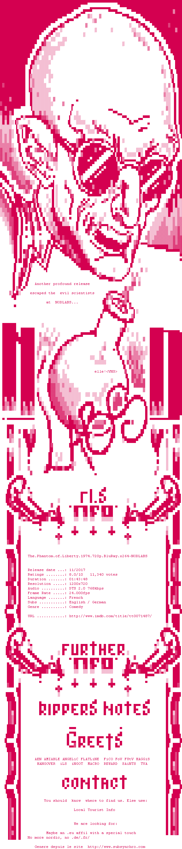 Voir le nfo de la release The.Phantom.Of.Liberty.1974.1080p.BluRay.x264-NODLABS