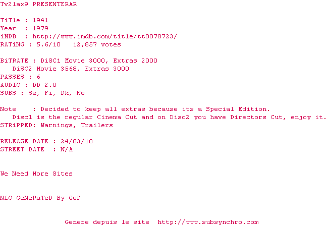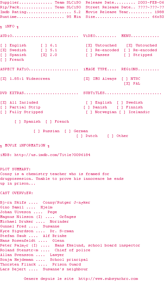 Voir le nfo de la release Strul.1988.SWEDiSH.COMPLETE.PAL.DVDR-SLCiSO