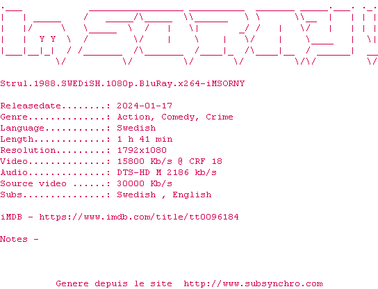 Voir le nfo de la release Strul.1988.SWEDiSH.1080p.BluRay.x264-iMSORNY