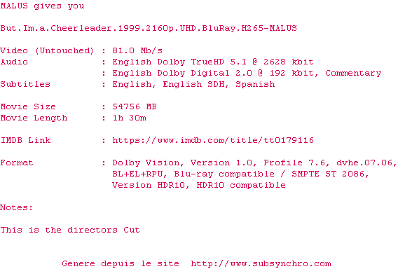 Voir le nfo de la release But.Im.A.Cheerleader.1999.2160p.UHD.BluRay.H265-MALUS