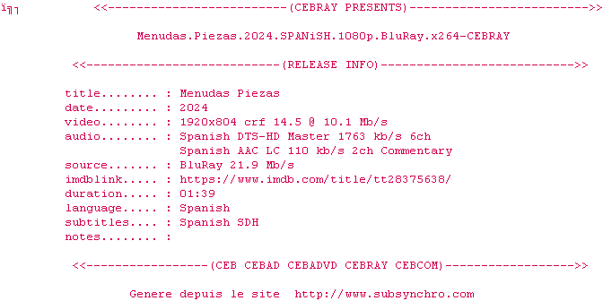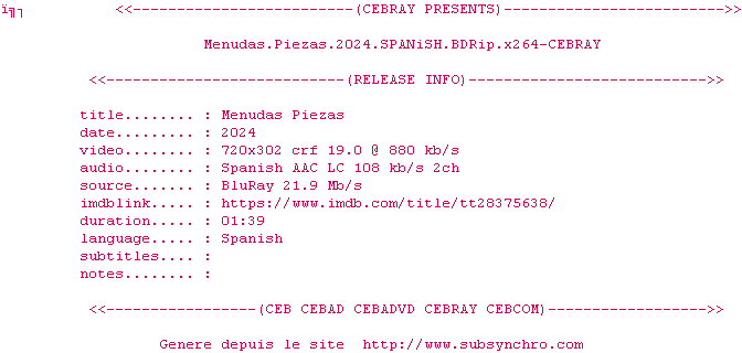 Voir le nfo de la release Menudas.Piezas.2024.SPANiSH.BDRip.x264-CEBRAY