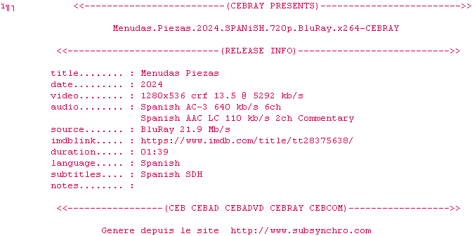 Voir le nfo de la release Menudas.Piezas.2024.SPANiSH.720p.BluRay.x264-CEBRAY