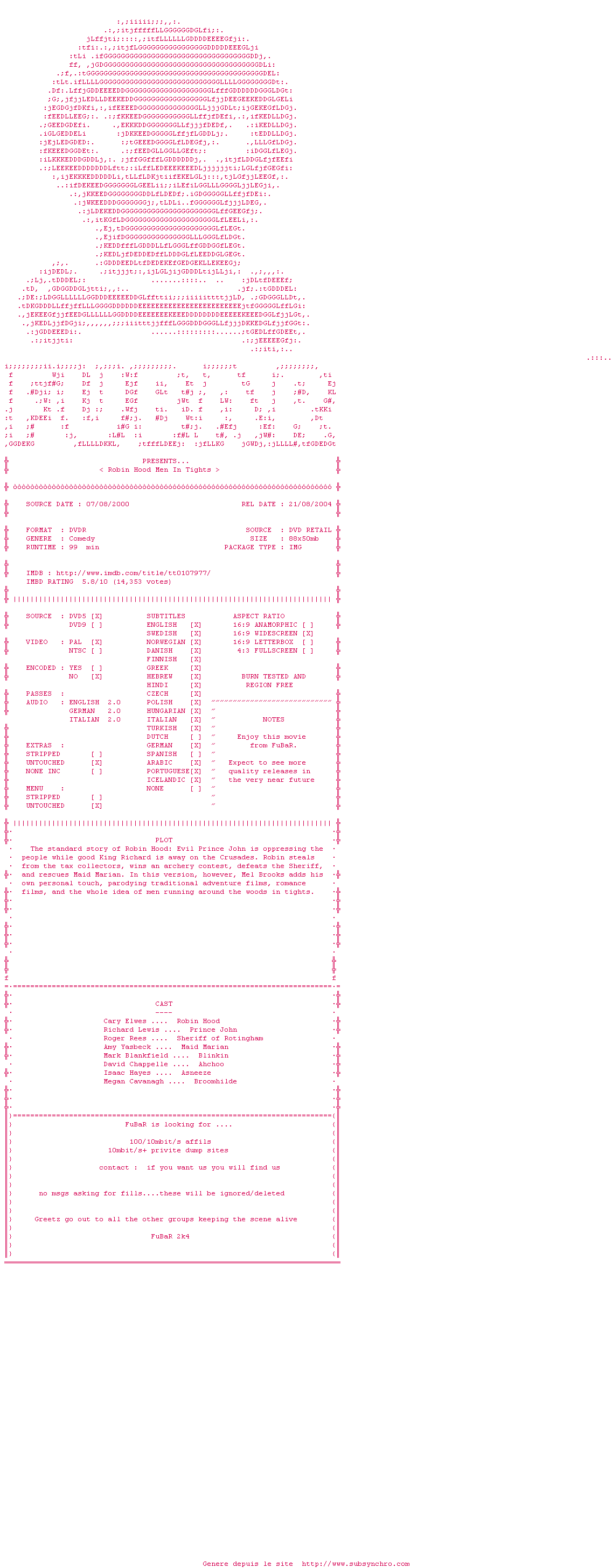 Voir le nfo de la release Robin.Hood.Men.In.Tights.1993.COMPLETE.PAL.iNTERNAL.DVDR-FuBaR