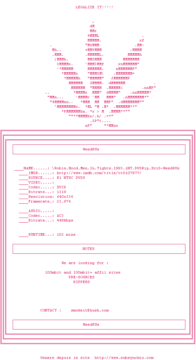Voir le nfo de la release Robin.Hood.Men.In.Tights.1993.iNT.DVDRip.XviD-WeedRUs