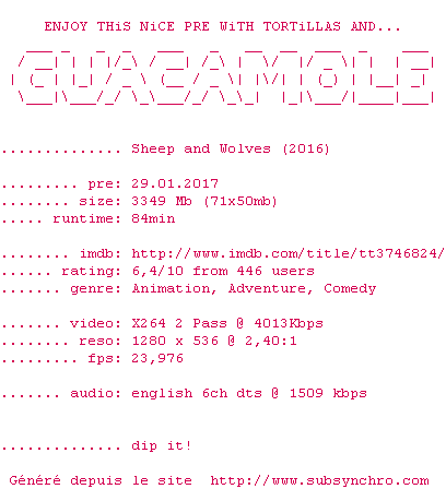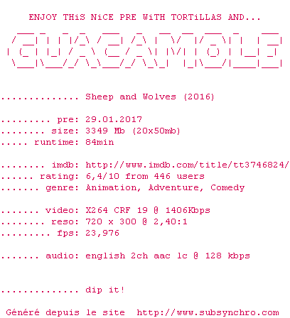 Voir le nfo de la release Sheep.And.Wolves.2016.BDRiP.x264-GUACAMOLE