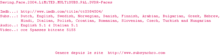 Voir le nfo de la release Saving.Face.2004.LiMiTED.MULTiSUBS.PAL.DVDR-Faces