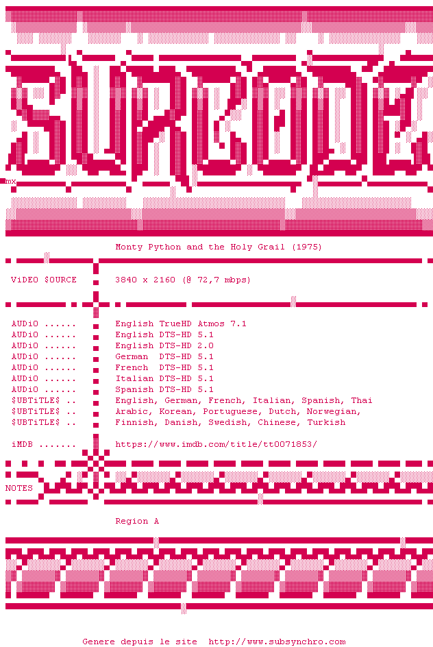 Voir le nfo de la release Monty.Python.And.The.Holy.Grail.1975.COMPLETE.UHD.BLURAY-SURCODE
