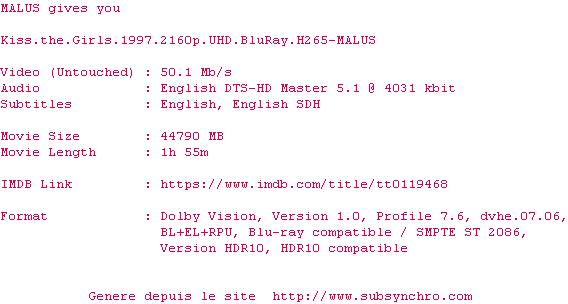 Voir le nfo de la release Kiss.The.Girls.1997.2160p.UHD.BluRay.H265-MALUS