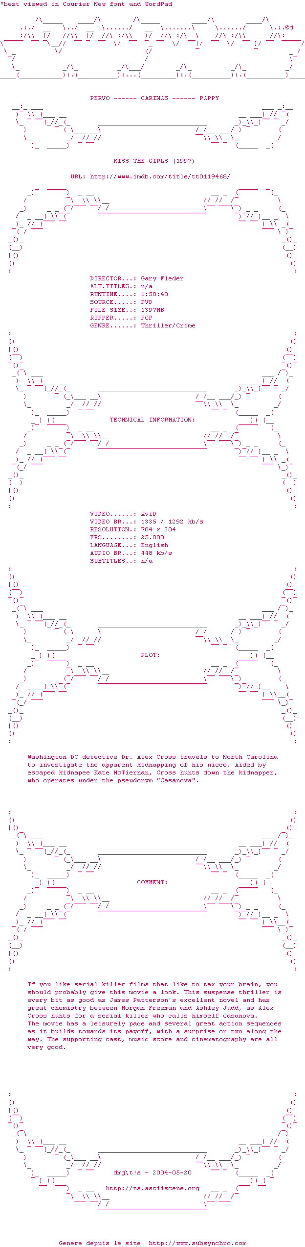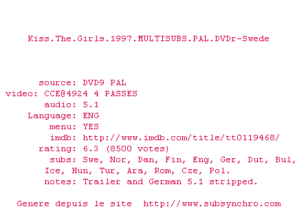 Voir le nfo de la release Kiss.The.Girls.1997.MULTISUBS.PAL.DVDr-Swede