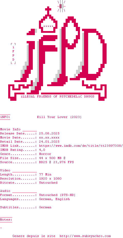 Voir le nfo de la release Kill.Your.Lover.2023.DUAL.COMPLETE.BLURAY-iFPD