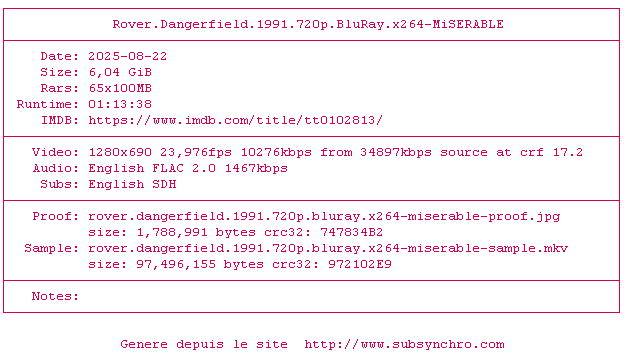 Voir le nfo de la release Rover.Dangerfield.1991.720p.BluRay.x264-MiSERABLE