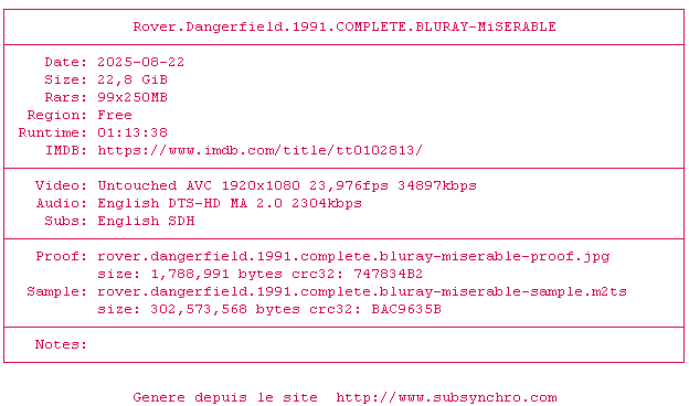 Voir le nfo de la release Rover.Dangerfield.1991.1080p.BluRay.x264-MiSERABLE