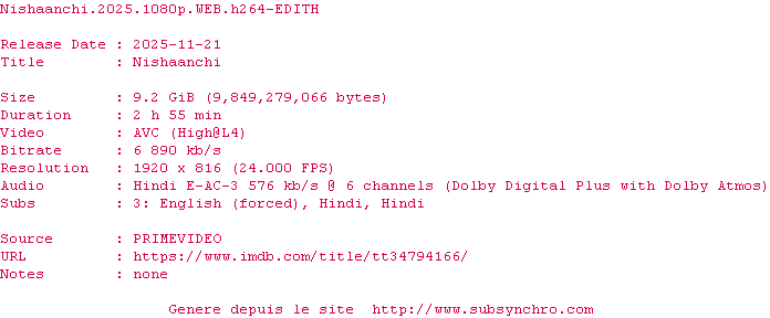 Voir le nfo de la release Nishaanchi.2025.HDR.2160p.WEB.H265-EDITH