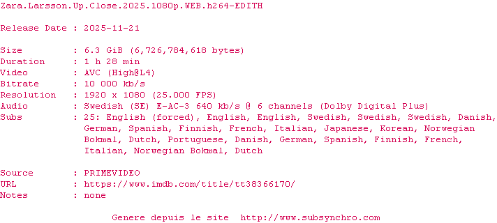 Voir le nfo de la release Zara.Larsson.Up.Close.2025.1080p.WEB.H264-EDITH