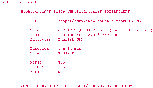 Voir le nfo de la release Bucktown.1975.2160p.UHD.BluRay.H265-MALUS