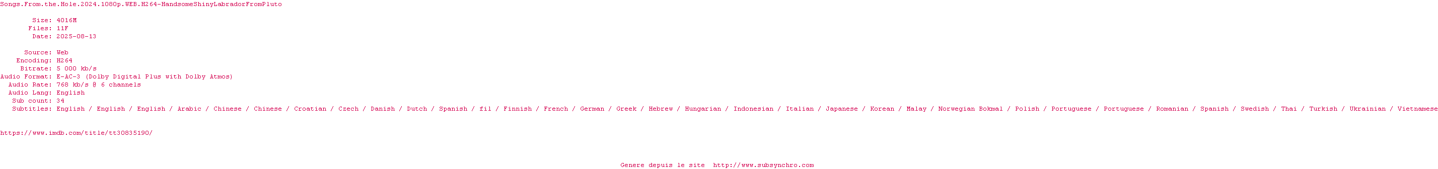Voir le nfo de la release Songs.From.The.Hole.2024.1080p.WEB.H264-HandsomeShinyLabradorFromPluto