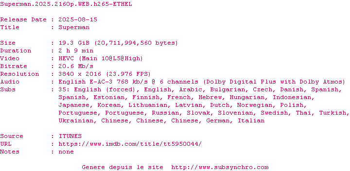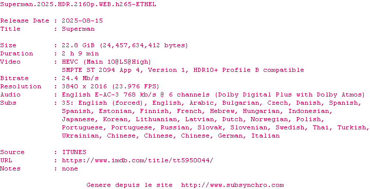 Voir le nfo de la release Superman.2025.HDR.2160p.WEB.H265-ETHEL