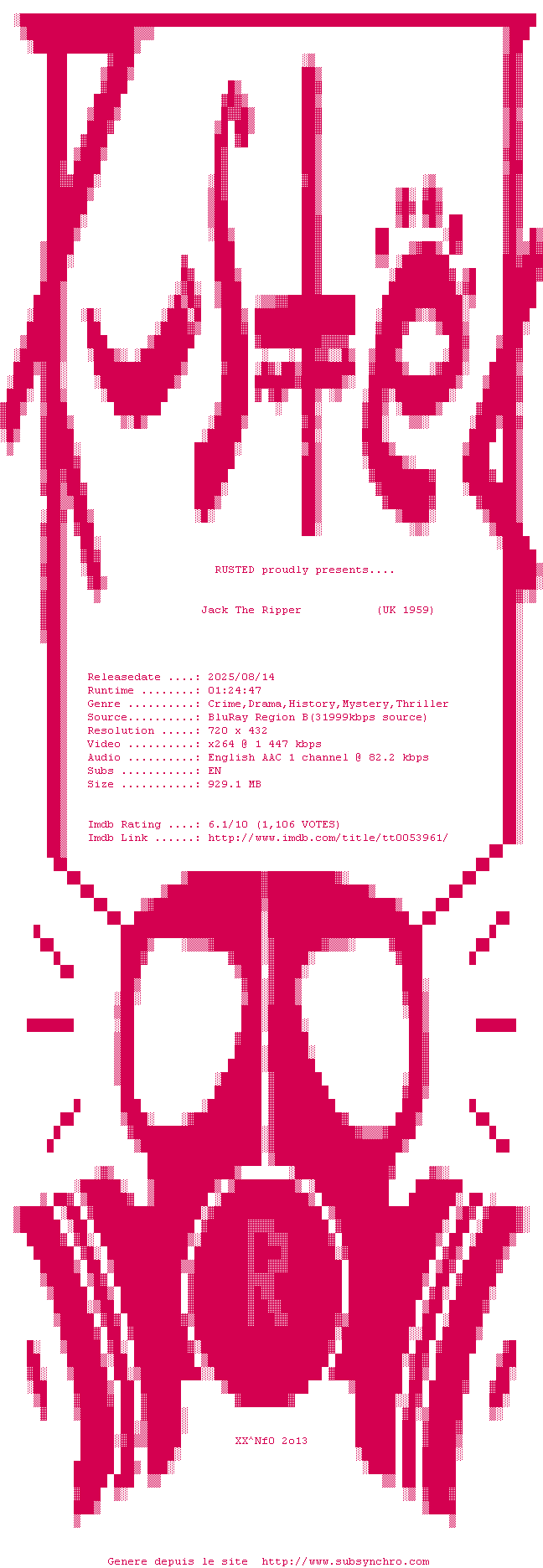 Voir le nfo de la release Jack.The.Ripper.1959.US.VERSION.BDRip.x264-RUSTED