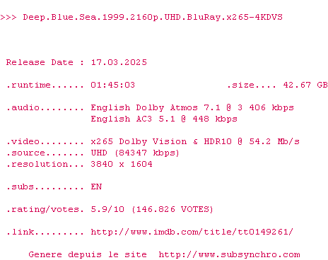 Voir le nfo de la release Deep.Blue.Sea.1999.2160p.UHD.BluRay.x265-4KDVS