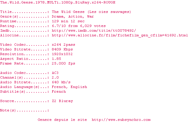 Voir le nfo de la release The.Wild.Geese.1978.MULTi.1080p.BluRay.x264-ROUGH