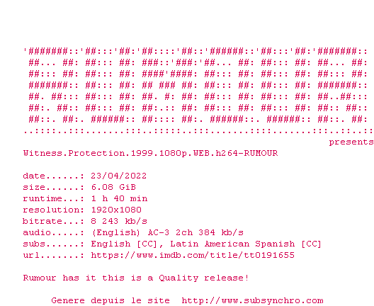 Voir le nfo de la release Witness.Protection.1999.1080p.WEB.H264-RUMOUR