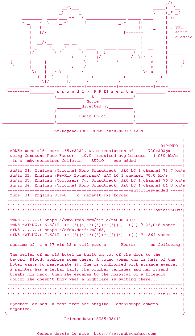 Voir le nfo de la release The.Beyond.1981.1080P.BLURAY.H264-UNDERTAKERS