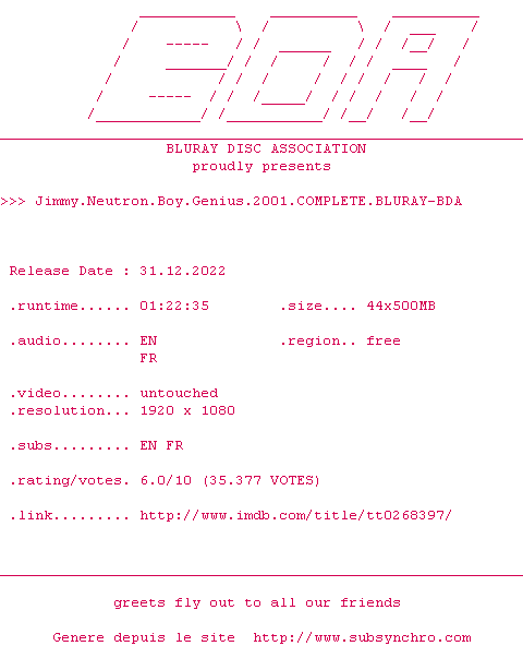 Voir le nfo de la release Jimmy.Neutron.Boy.Genius.2001.COMPLETE.BLURAY-BDA