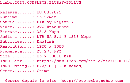 Voir le nfo de la release Limbo.2023.COMPLETE.BLURAY-B3LLUM