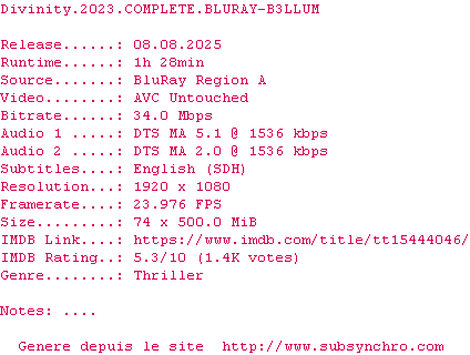 Voir le nfo de la release Divinity.2023.COMPLETE.BLURAY-B3LLUM