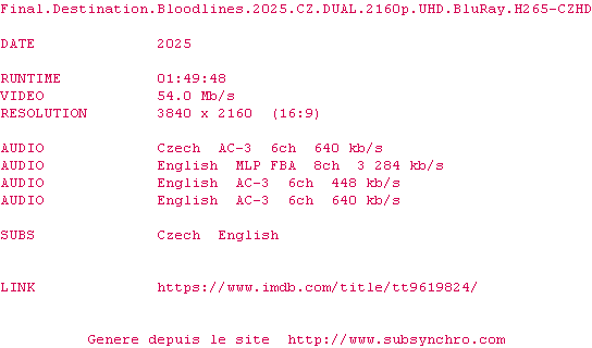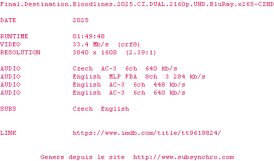 Voir le nfo de la release Final.Destination.Bloodlines.2025.CZ.DUAL.2160p.UHD.BluRay.H265-CZHD
