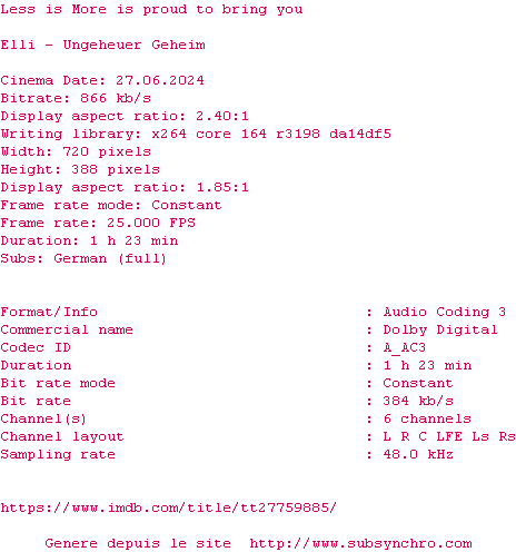 Voir le nfo de la release Elli.Ungeheuer.Geheim.GERMAN.2024.AC3.DVDRip.x264-LIM