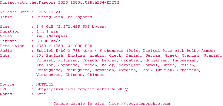 Voir le nfo de la release Dining.With.The.Kapoors.2025.1080p.WEB.H264-EDITH