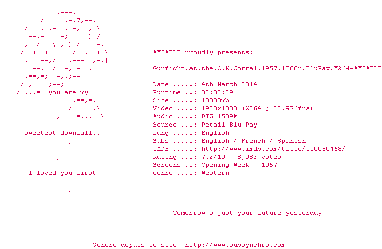 Voir le nfo de la release Gunfight.at.the.O.K.Corral.1957.1080p.BluRay.X264-AMIABLE