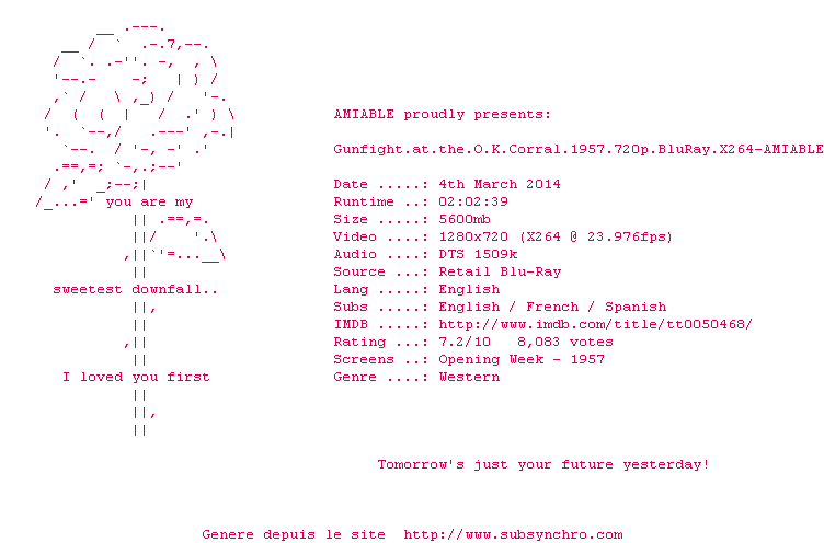 Voir le nfo de la release Gunfight.at.the.O.K.Corral.1957.720p.BluRay.X264-AMIABLE