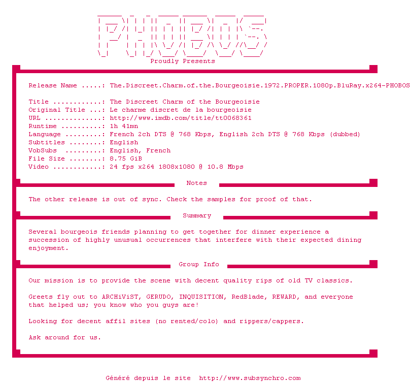 Voir le nfo de la release The.Discreet.Charm.of.the.Bourgeoisie.1972.PROPER.1080p.BluRay.x264-PHOBOS