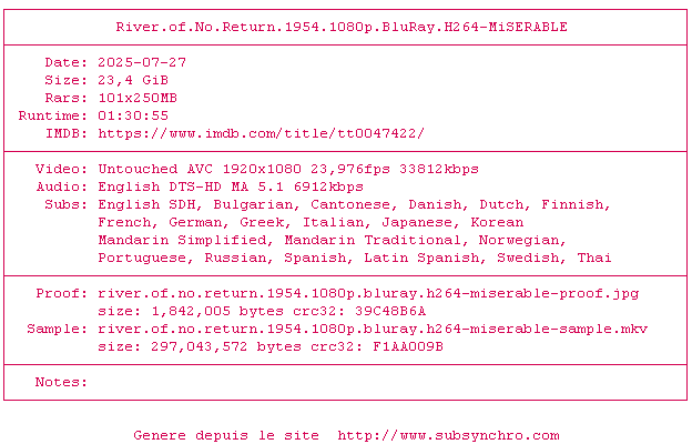 Voir le nfo de la release River.Of.No.Return.1954.1080p.BluRay.H264-MiSERABLE