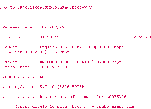 Voir le nfo de la release Up.1976.2160p.UHD.BluRay.H265-WOU