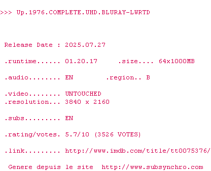 Voir le nfo de la release Up.1976.COMPLETE.UHD.BLURAY-LWRTD