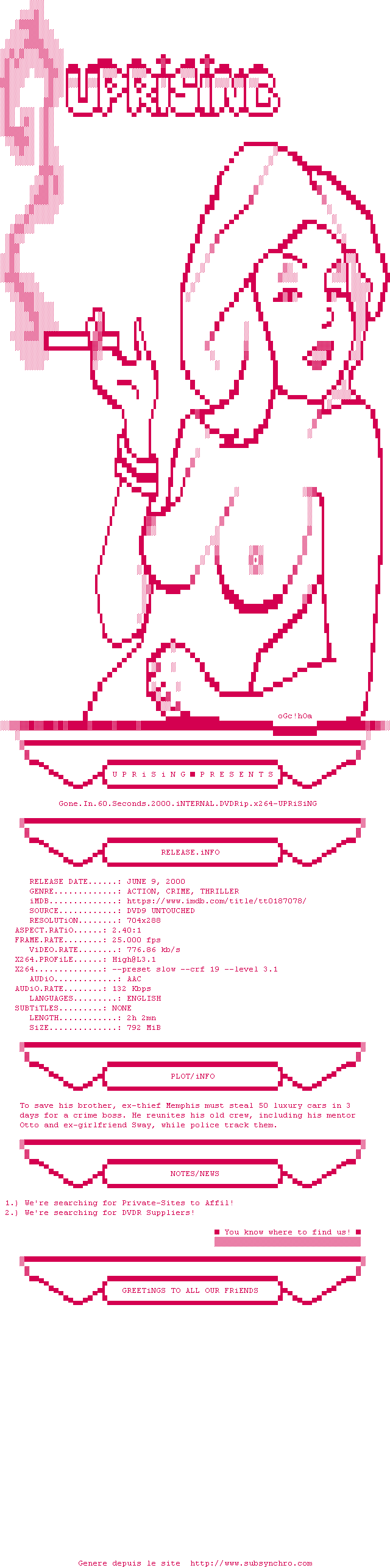Voir le nfo de la release Gone.In.60.Seconds.2000.iNTERNAL.DVDRip.x264-UPRiSiNG