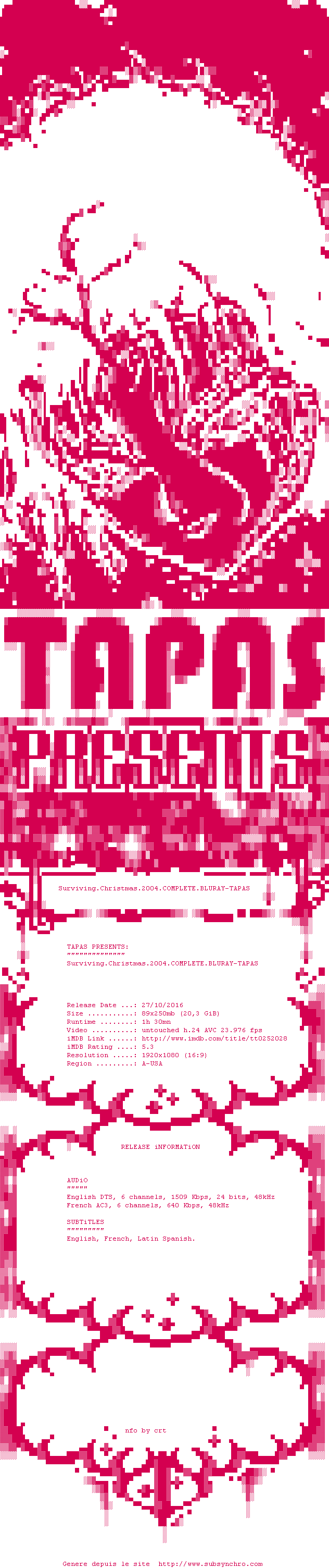 Voir le nfo de la release Surviving.Christmas.2004.COMPLETE.BLURAY-TAPAS