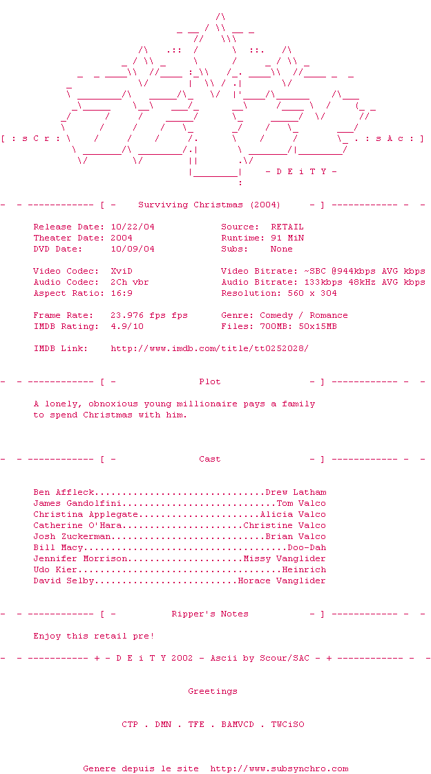 Voir le nfo de la release Surviving.Christmas.2004.DVDRip.XviD-DEiTY