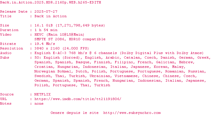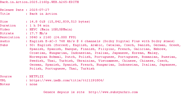 Voir le nfo de la release Back.In.Action.2025.HDR.2160p.WEB.H265-EDITH
